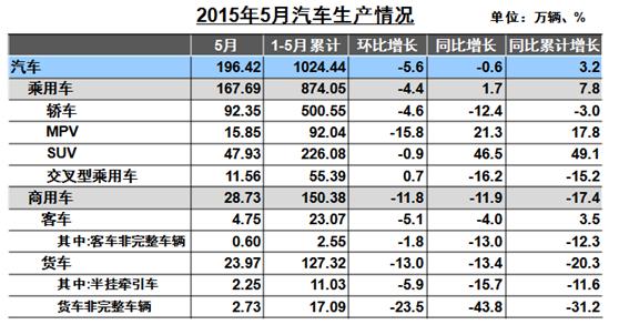 1-5月,MPV产销量分别为92.04万辆和89.03万辆,产销增速超过15%,分别为17.8%和17.9%。5月,MPV的产销量为15.85万辆和14.05万辆,环比下降15.8%和15.9%。